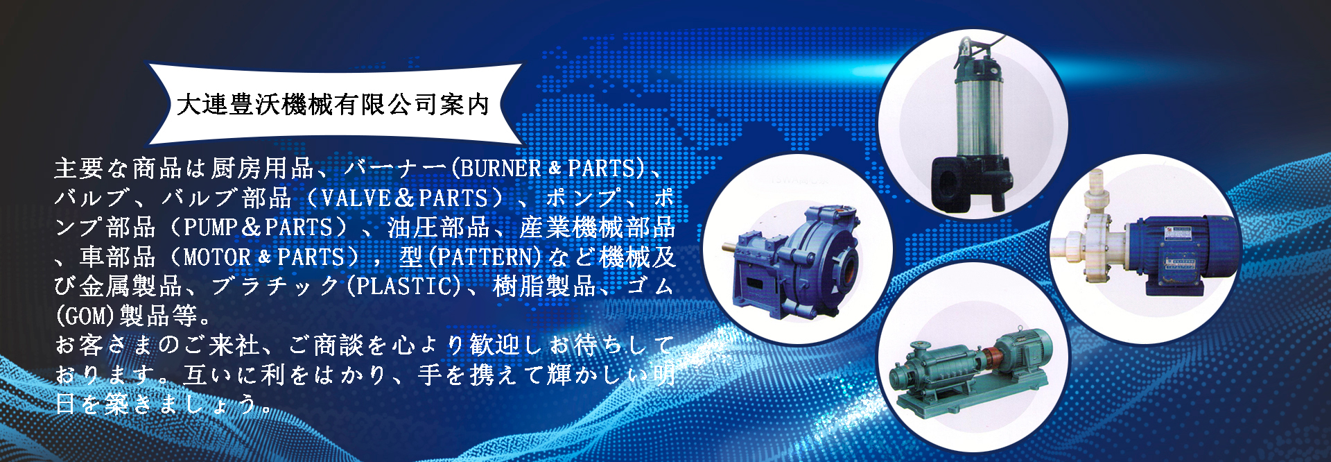 大連豊沃機械有限公司は國際貿易を主にして 専門商社でおり、子會社の機械加工工場を1社持ち、業(yè)務提攜パトーナが數社あります。國際貿易を従事して十年以上、メインは日本向けですが、アメリカ、ューロパ市場向けも少しあります。砂鋳造(CASTING)(FC,FCD,FACD,ADI)、ロストワックス(LOST-WAX)、鋳鋼(SC,SCS)、ステンレス(SUS)、ダイカスト(DIE-CASTING)(アルミ、真鍮)、鍛造(FORGING)、プレス(PRESS)、製缶(WELDING)など幅多く分野ております。主要な商品は廚房用品、バーナー(BURNER﹠PARTS)、バルブ、バルブ部品(VALVE&PARTS)、ポンプ、ポンプ部品(PUMP&PARTS)、油圧部品、産業(yè)機械部品、車部品(MOTOR﹠PARTS),型(PATTERN)など機械及び金屬製品、ブラチック(PLASTIC)、樹脂製品、ゴム(GOM)製品等。